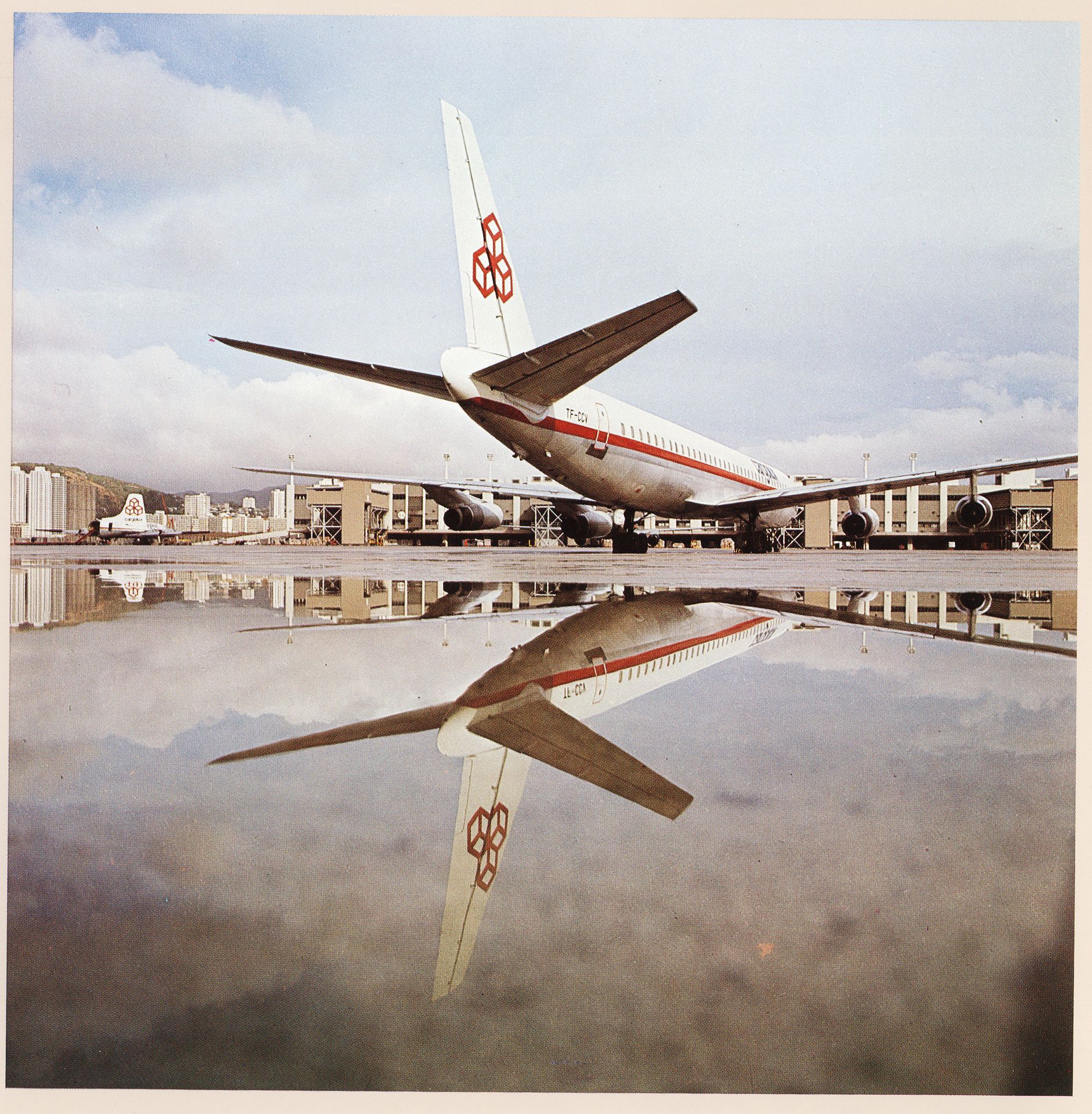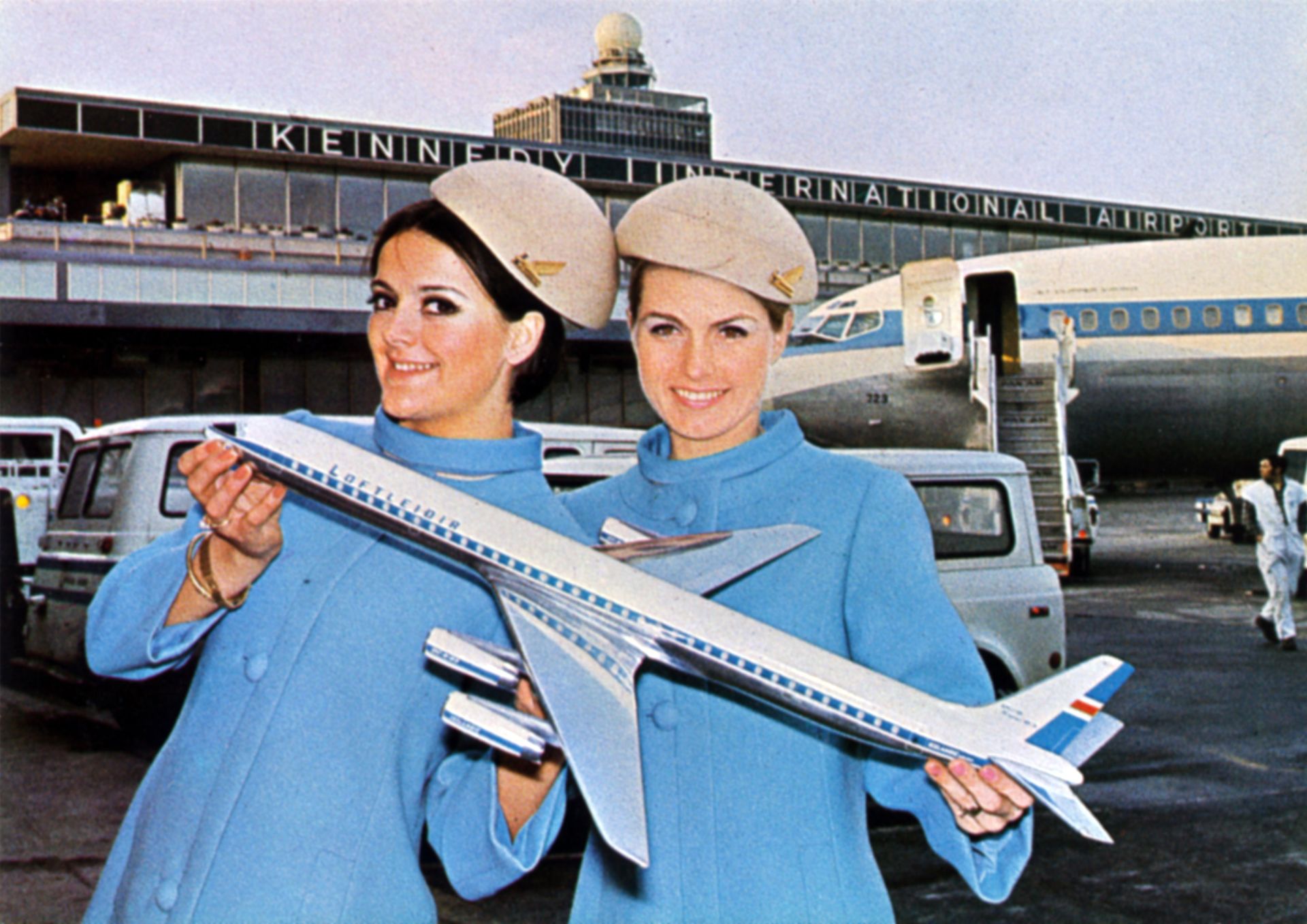 Susie Carlén og Erna Hrólfsdóttir flugfreyjur (og fyrirsætur) halda á módeli af DC-8-63 á JFK flugvelli. Í baksýn er DC-8-63 þota Loftleiða. Þessi mynd var gefin út á póstkorti 1971.