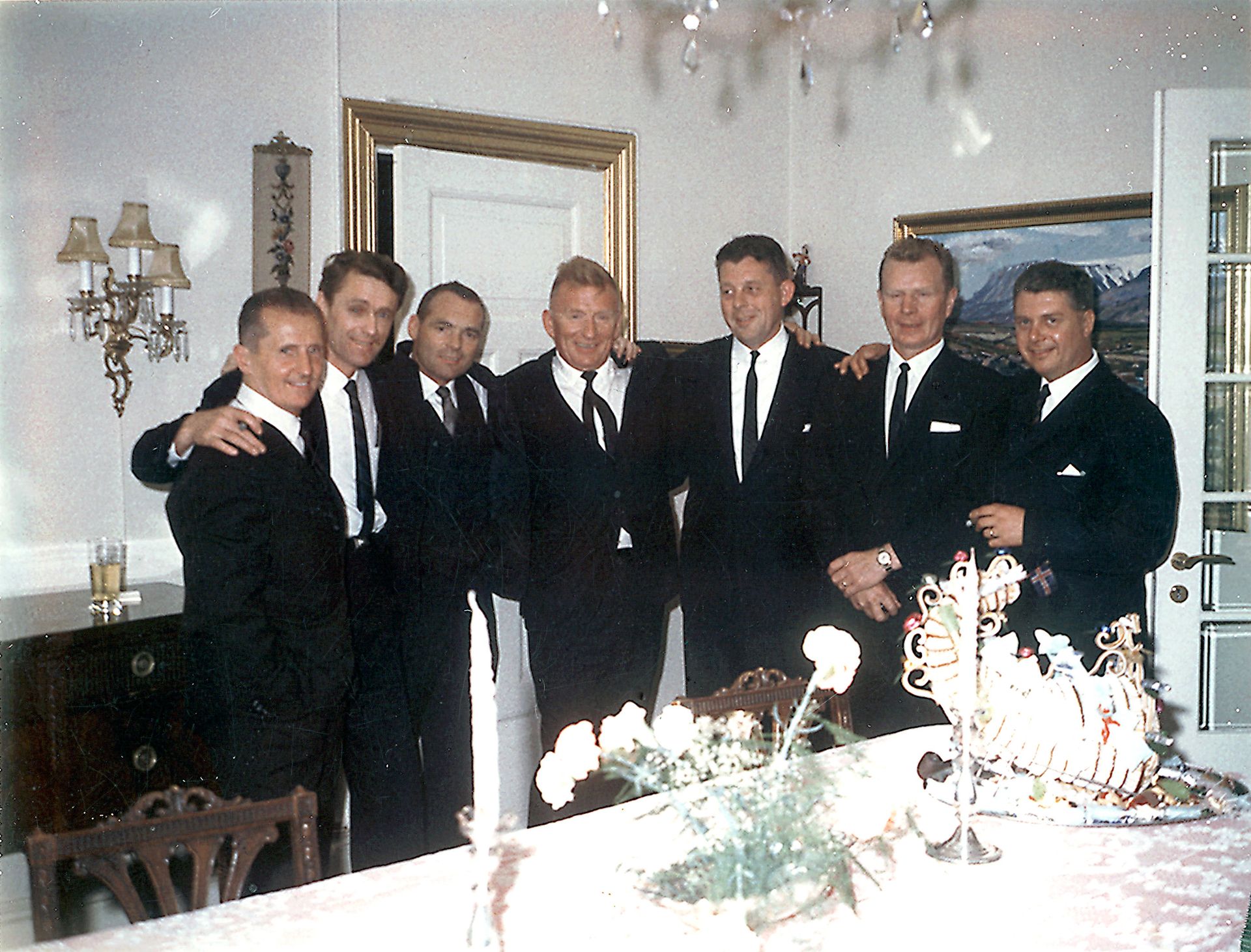 Alfreð Elíasson í hópi vina sinna, flugmanna Loftleiða.