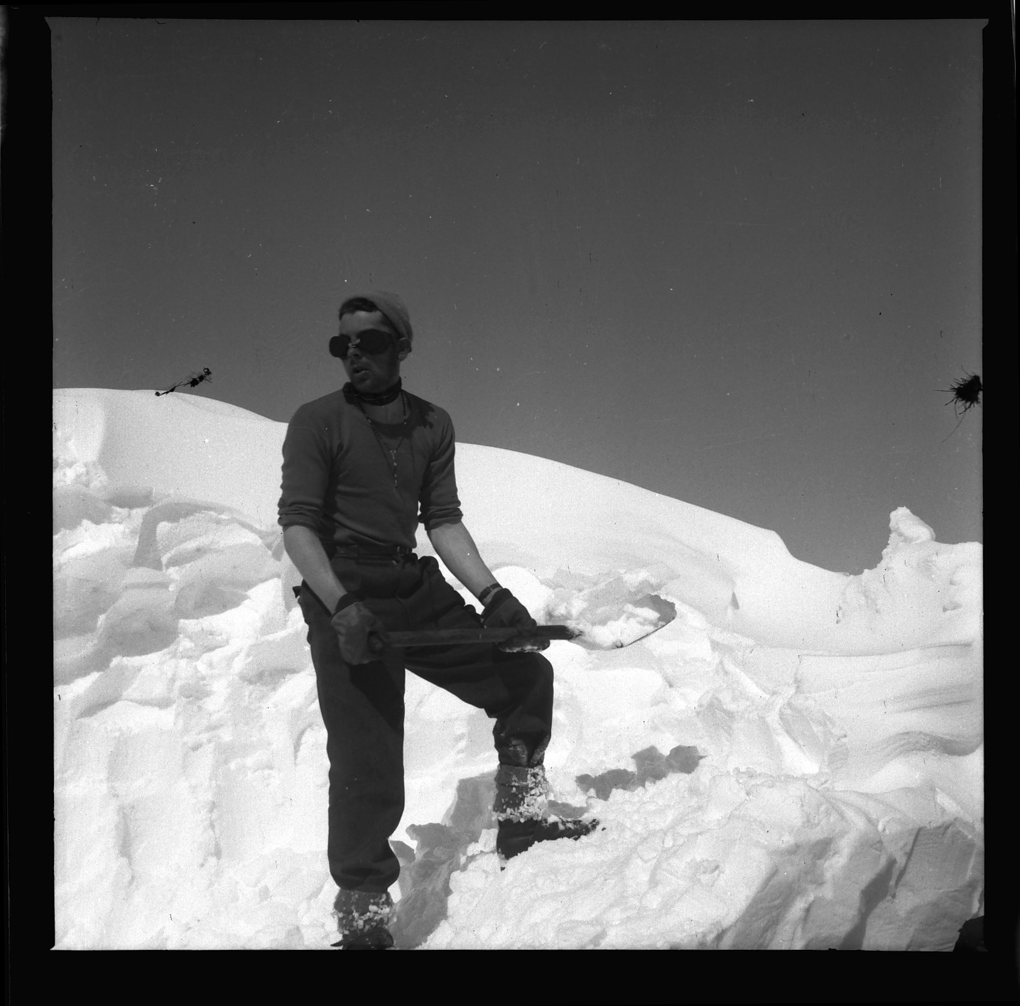 Alfreð Elíasson mokar snjó ofan af björgunarvélinni sem festist á jöklinum þegar hún var notuð til að sækja áhöfn Geysis eftir að hann flaug á Bárðarbungu 1950.