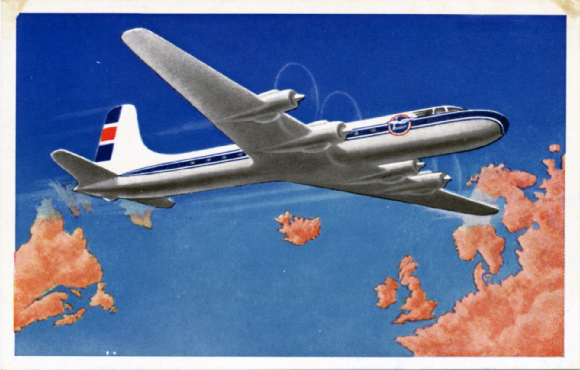 DC-6 að tengja saman Norður Ameríku og Evrópu með Ísland á milli. Þetta er póstkort