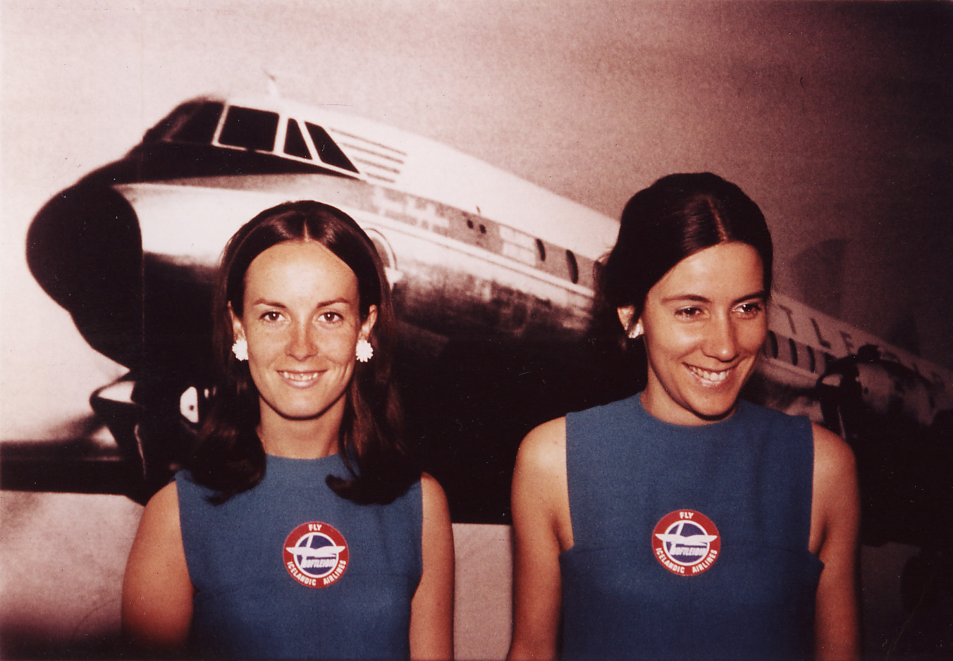 Tvær ónefndar flugfreyjur með CL-44 á bak við sig. Skrúfuþotan CL-44 sem kölluð var Monsi vegna þess hve stór hún var, var stærsta farþegaflugvélin á Atlantshafinu um tíma. Hún tók 189 farþegar eftir að búið var að lengja hana.