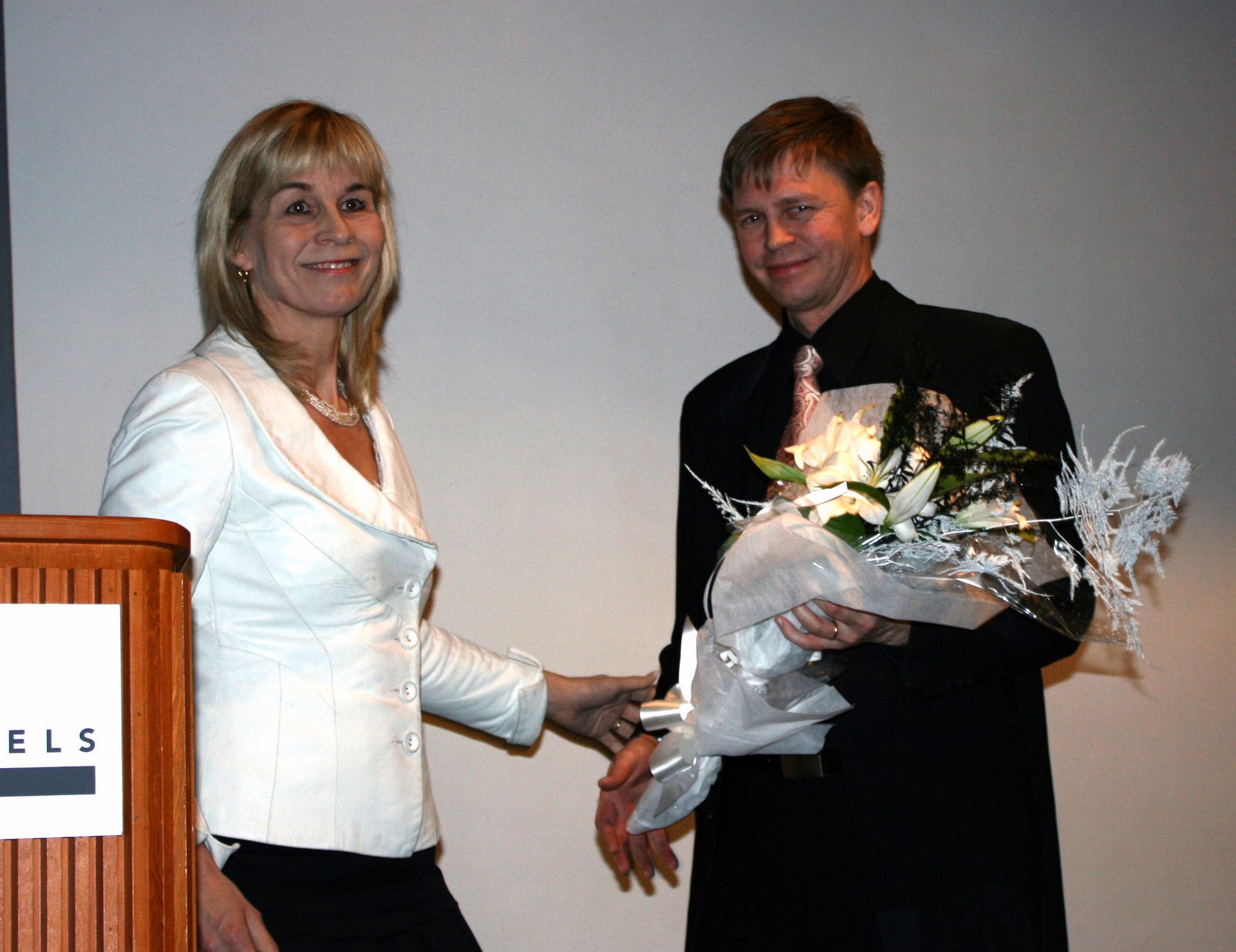 Geirþrúður Alfreðsdóttir afhendir Sigurgeiri Orra Sigurgeirssyni blómvönd á frumsýningu myndarinnar á Hótel Loftleiðum 29. desember 2008.