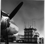 Hekla við gamla flugturninn á Reykjavíkurflugvelli.